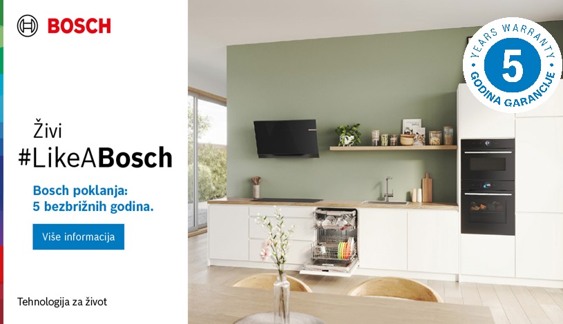 Ako u periodu od 1.4. do 30.11.2026. godine kupite i registrujete ugradbeni kuhinjski aparat: ugradbenu mašinu za suđe, ugradbeni frižider ili zamrzivač Bosch Vam poklanja 5-godišnju garanciju.