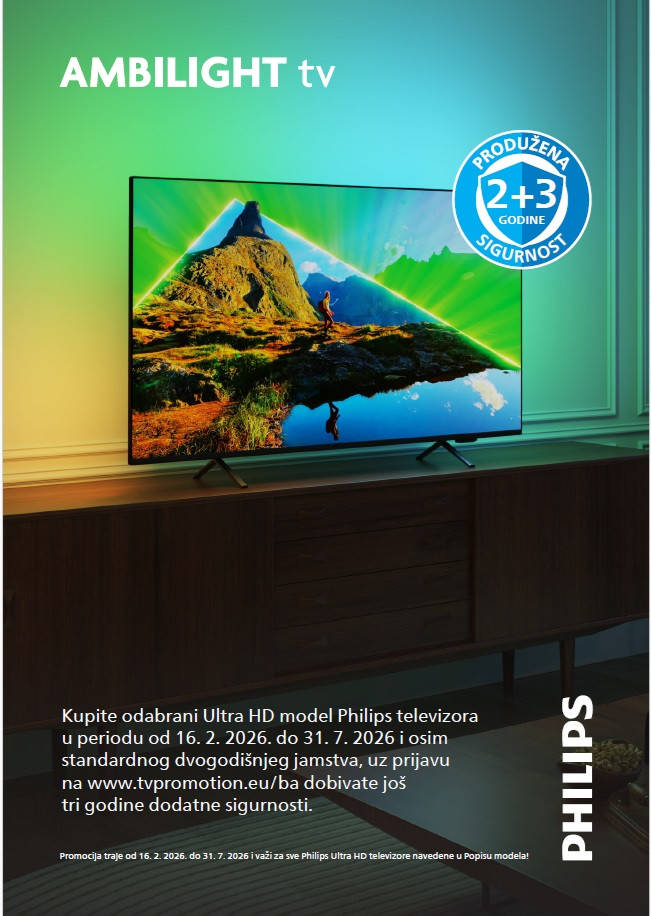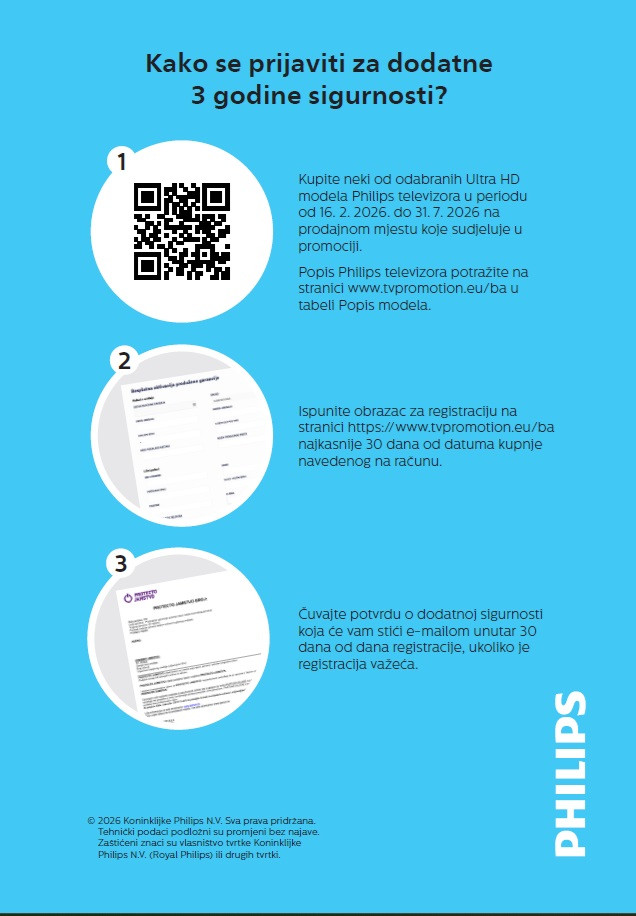 Kupovinom odabranih uređaja brenda Philips ostvarujete čak 5 godina bezbrižnosti – 2 godine redovne + 3 godine produžene garancije! Registraciju možete izvršiti na: https://tvpromotion.eu/ba/ Više detalja u nastavku: